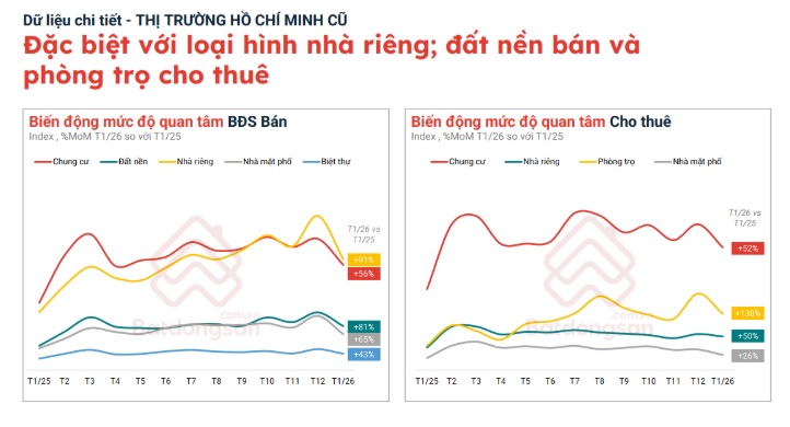 Phòng trọ cho thuê là phân khúc có sự gia tăng mạnh mẽ với mức tăng 130% so với tháng 1/2025. Các loại hình khác như chung cư và nhà riêng cho thuê cũng có mức tăng trưởng lần lượt là 52% và 50%.